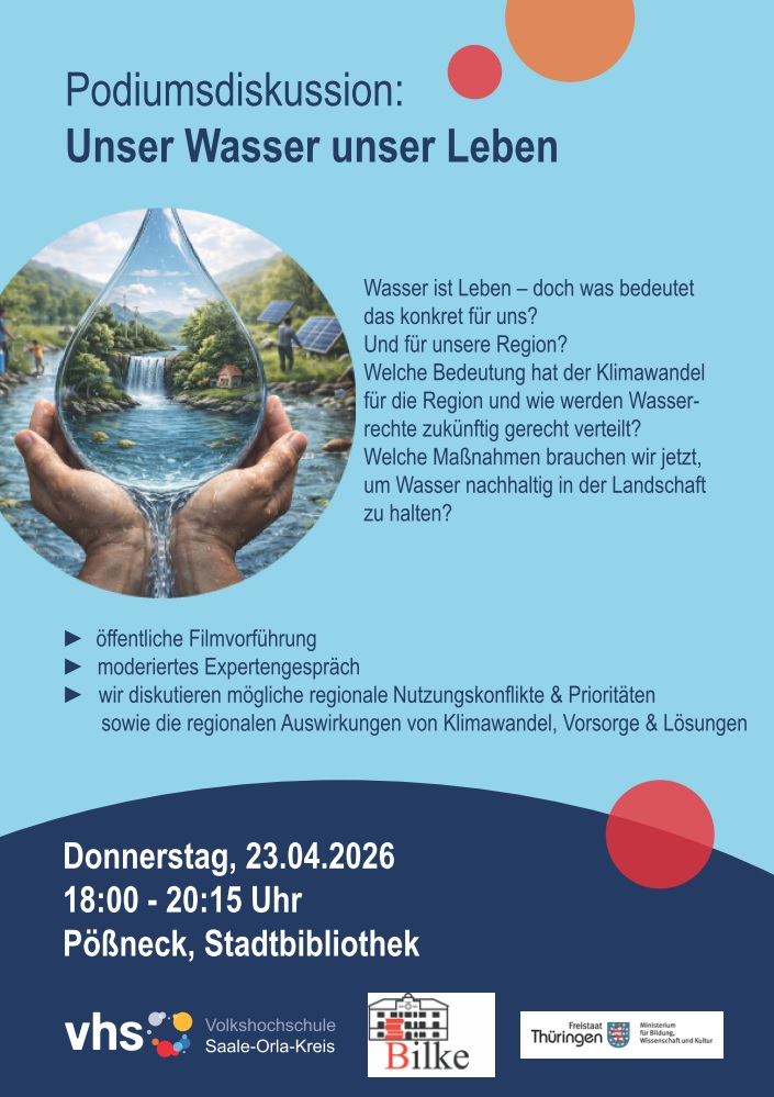 Im Rahmen der Nachhaltigkeitswochen 2026 veranstalten die Volkshochschule Saale-Orla-Kreis und die Stadt Pößneck erneut eine öffentliche und moderierte Podiumsdiskussion zum Thema „Wasser“. Dabei werden Chancen und Risiken im Saale-Orla-Kreis im Gesprächsmittelpunkt einer durch uns ins Leben gerufenen Expertendiskussion stehen.